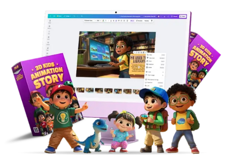 Complete collection of Pixar-style 3D animated kids stories with educational themes and positive messages. Includes editable video templates, voiceovers, marketing materials and full PLR rights. Ideal for you to sell kids edutainment content, story packs or branded digital products.