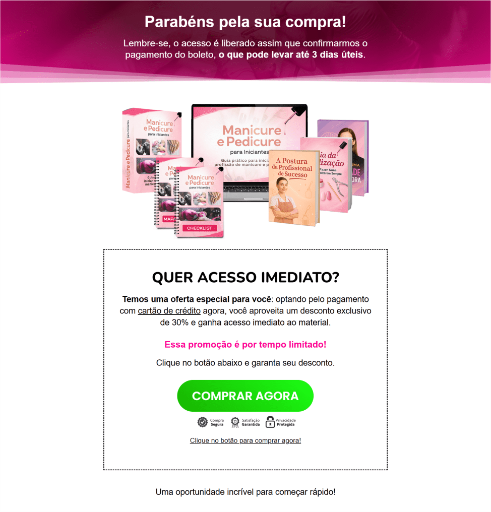 Aqui, você dá um novo motivo para ele agir na hora: um desconto de 30% (ou a porcentagem que você escolher) se trocar o boleto pelo cartão de crédito imediatamente.