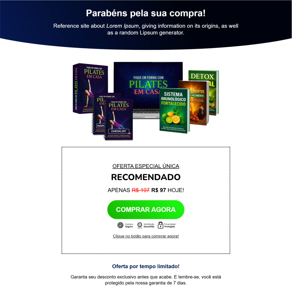 Se ainda não tiver outro produto pronto, basta escolher um em nosso site que complemente o guia Fique em Forma com Pilates em Casa e promover aqui.