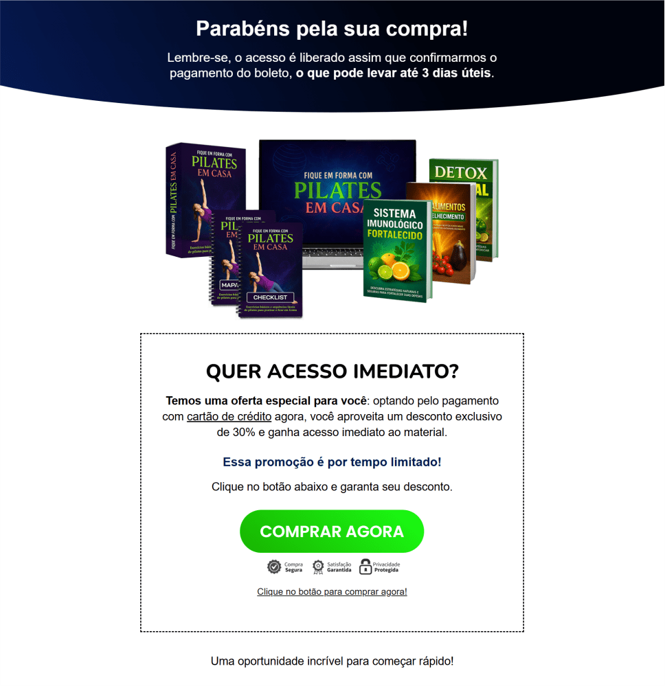 Abaixo, você tem uma prévia da página de obrigado que recupera boletos e aumenta seus lucros.