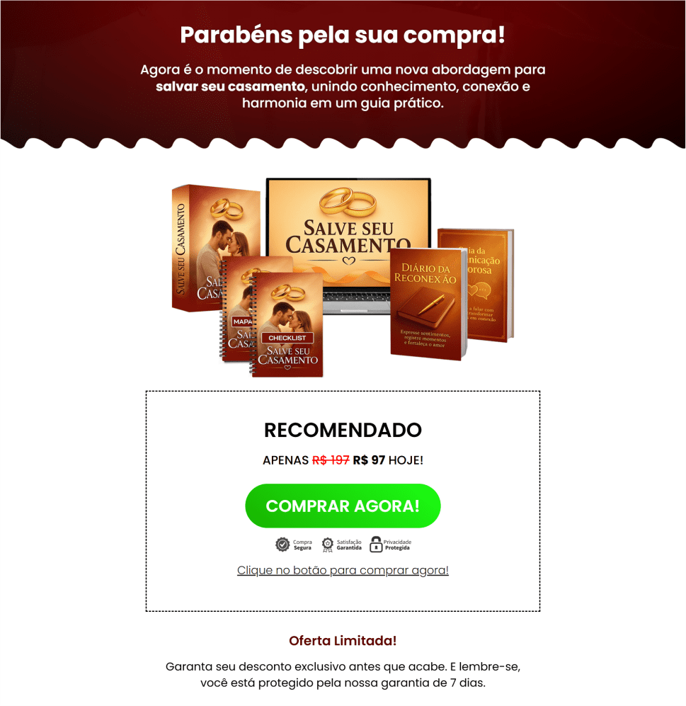 Salve seu Casamento é um guia essencial para quem deseja resgatar o relacionamento, reconstruir confiança e recuperar o amor — com passos simples, práticos e aplicáveis no dia a dia.