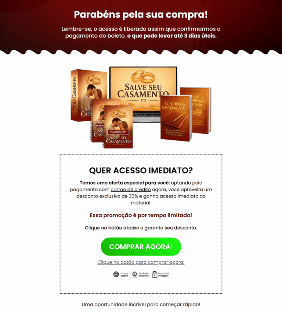 Abaixo, você tem uma prévia da página de obrigado que recupera boletos e aumenta seus lucros.