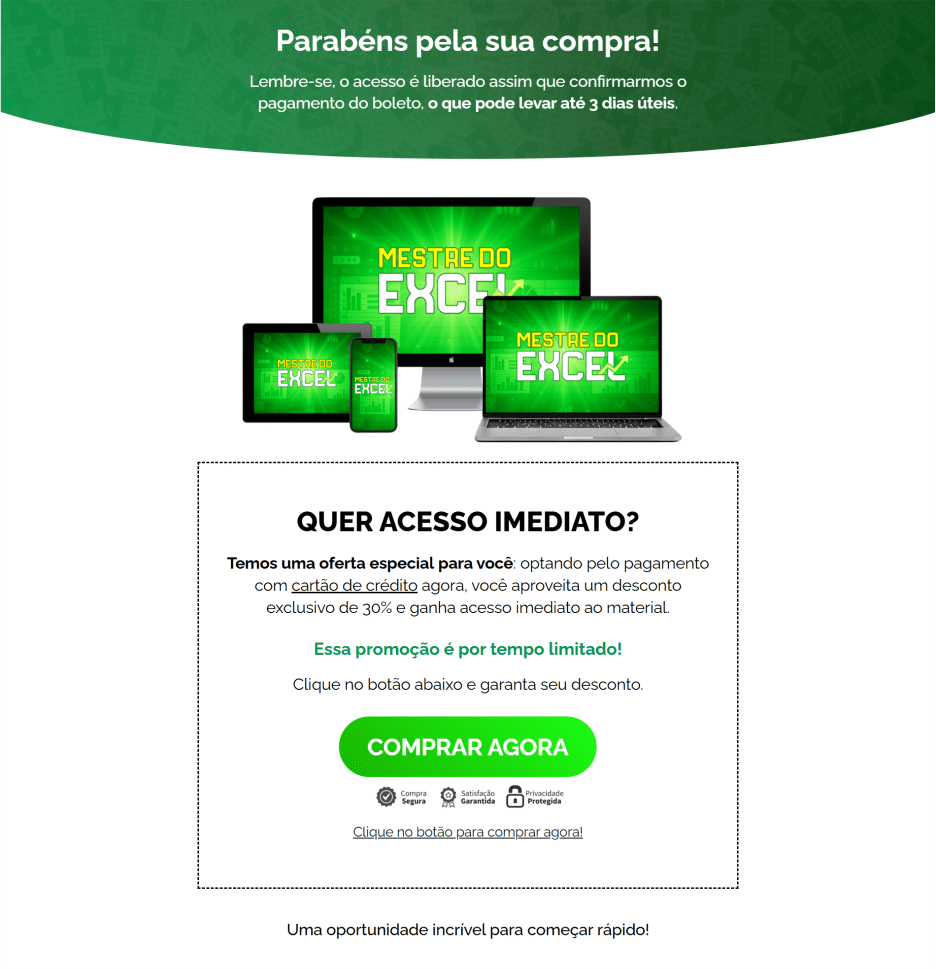 Aqui, você dá um novo motivo para ele agir na hora: um desconto de 30% (ou a porcentagem que você escolher) se trocar o boleto pelo cartão de crédito imediatamente.